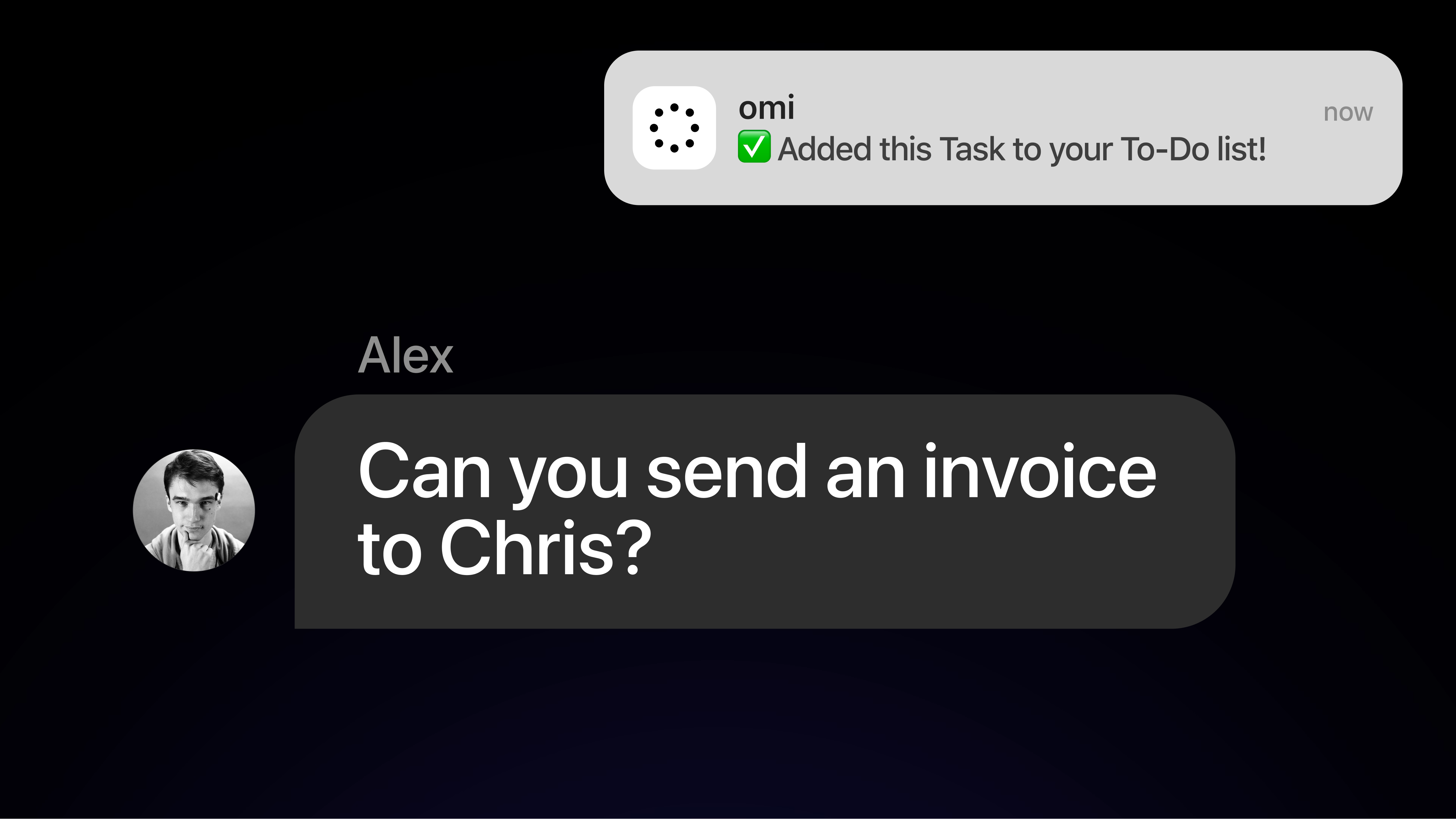 Omi listens to your conversations and automatically identifies action items. When someone asks you to do something, it's already on your to-do list.